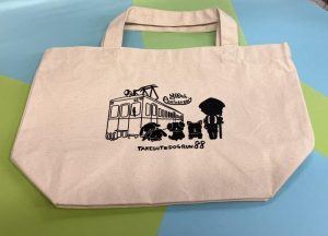 記念グッズには、電車はもちろん お遍路さん、わんちゃん、うさちゃんのイラストが可愛く描かれた 88だけのオリジナルのトートバックを作りました